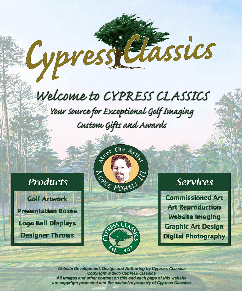 to Cypress Classics Page to The Artists Page Graphic Art Design WEbsite Imaging Art Reproduction Commissioned Art Designer Throws Logo Ball Displays Presentation Boxes Golf Artwork Link to Services Page Link to Products Page